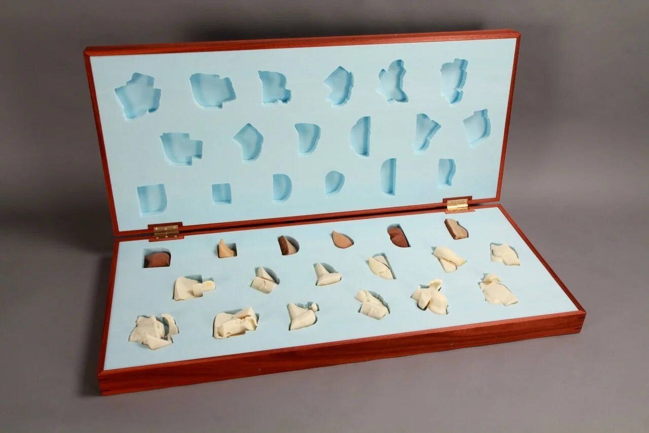 These small sculptures were then individually and carefully packed in the ‘Fortescue’s Boxes’ and shipped across the country to Matthew Hebert waiting with great anticipation in San Diego, California, all the way across the US – 2,700 miles (a tad less than the 3,550 miles covered by Bartram’s Boxes). Matthew then opened the boxes (conserving them carefully) and began work on his technical translation of Donald’s specimens. Utilizing an array of reverse engineering (3D scanners) and digital fabrication technologies (CNC machines and 3D Printers), Matthew translated the hand-hewn objects into 3D computer models, manipulated them in software, and then re-created them as physical objects. He created negatives of the whittlings and then remounted these in the original boxes; framed and lit from within they resemble Victorian cameos. The descriptions provided by the whittlers were read by the original artists and then the recordings linked to their respective cameos. When each cameo is lit, its description play in the vintage headphones included in the piece.